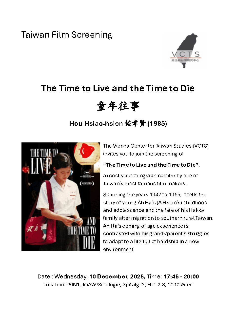 The Vienna Center for Taiwan Studies (VCTS) invites you to join the screening of “The Time to Live and the Time to Die”, a mostly autobiographical film by one of Taiwan’s most famous film makers. Spanning the years 1947 to 1965, it tells the story of young Ah Ha’s (A Hsiao’s) childhood and adolescence and the fate of his Hakka family after migration to southern rural Taiwan. Ah Ha’s coming of age experience is contrasted with his grand-/parent’s struggles to adapt to a life full of hardship in a new environment.